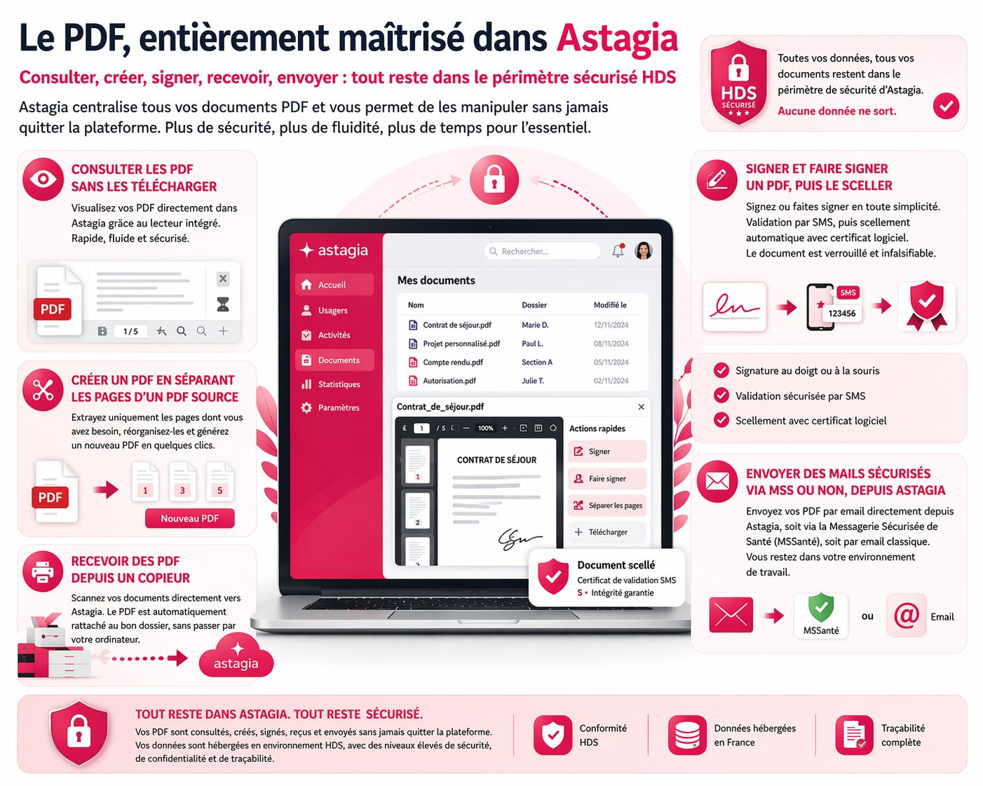 - Gestion documentaire : Les professionnels peuvent déposer, consulter et stocker des documents via la GED (Gestion Électronique des Documents). La volumétrie de stockage varie selon l’offre choisie (1Go, 10Go ou 100Go). La plateforme permet également de générer des documents Word à partir de modèles personnalisés avec les données d’Astagia. Il existe aussi une fonctionnalité d’enregistrement de PDF directement depuis les copieurs dans les profils bénéficiaires Astagia.